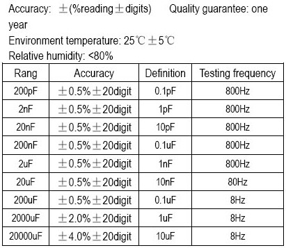 2000p/20n/200n/2µ/200µF ㊣(0.5%+1dgt) |