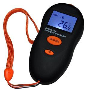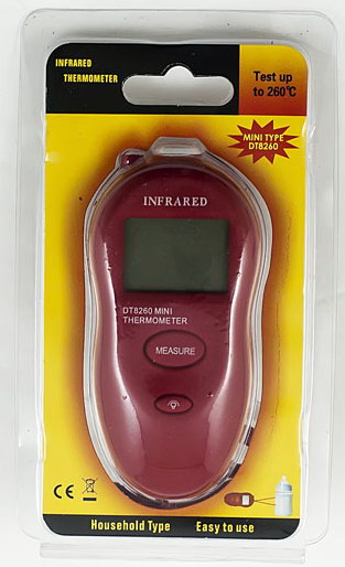 MINI Infrared Thermometer DT8001 1. Easy carry-mini size with belt for easy carry 2. Wide range-can test any surface of object 3. Display-Temperature display by LCD screen 4. F to C-Can convert the model with ºC or ºF 5. Safe-Test the temperature without contacting 6. Fast-Get the temperature data within 1 second 7. Easy operate-Everyone can operate it by guide