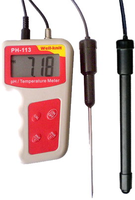 PH-113 Portable pH/Temperature meter High-precision; small size; simple, easy accessibility and the operation panel that makes machines easy to understand, easy to operate. Automatic temperature compensation, with the help of the temperature probe, can automatically correct the impact of temperature on the pH. Accurate thermometer, the temperature of an independent probe, the sensor can be quickly tested solution temperature. BNC with the composite electrode and 9 V battery, around the world to facilitate the replacement of batteries and electrodes. Economical and practical, fully in line with a wide range of industries need to test. Technical Specification: