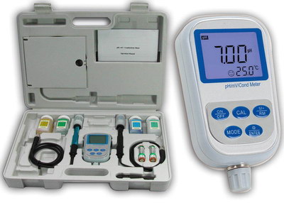 response speed and result accuracy. " -Automatically recognize 13 kinds of pH standard buffer solution. User can choose anyone from three series of buffer solutions: Europe & U.S.A. series, NIST series, China series. -High purified water and ammonia added purified water pH measuring mode can be set up, for this two special pH measuring modes, besides the general slope temperature compensation, also added function of nonlinearity solution temperature compensation to make measurement more accurate, especially suitable for the fields of electric power and petrochemical etc. -Adopts advanced automatic frequency convertible and voltage regulation technology to enlarge the measuring range of conductivity electrode which constant K=1 to 10 times. It can meet measuring accuracy requirement for range within 0 to 200mS/cm by using only one-point calibration. It is the particular one¨Cpoint calibration function for this meter. -Automatically recognize 8 kinds of conductivity standard solution. User can choose anyone from two series of standard solutions: Europe & USA series and CHINA series. -Automatically select conductivity measuring range, the meter will do non-linearity temperature compensation test for purified and high purified water less than 10uS/cm, which greatly improve the measuring accuracy. It is especially suitable for use in fields of electric power, microelectronics and medicine. -Meter's circuit board adopts SMT film-covering technology to improve meter's production reliability. -Meter has the back light LCD display monitor. 1-Dustproof and waterproof meter meets IP57 rating. |